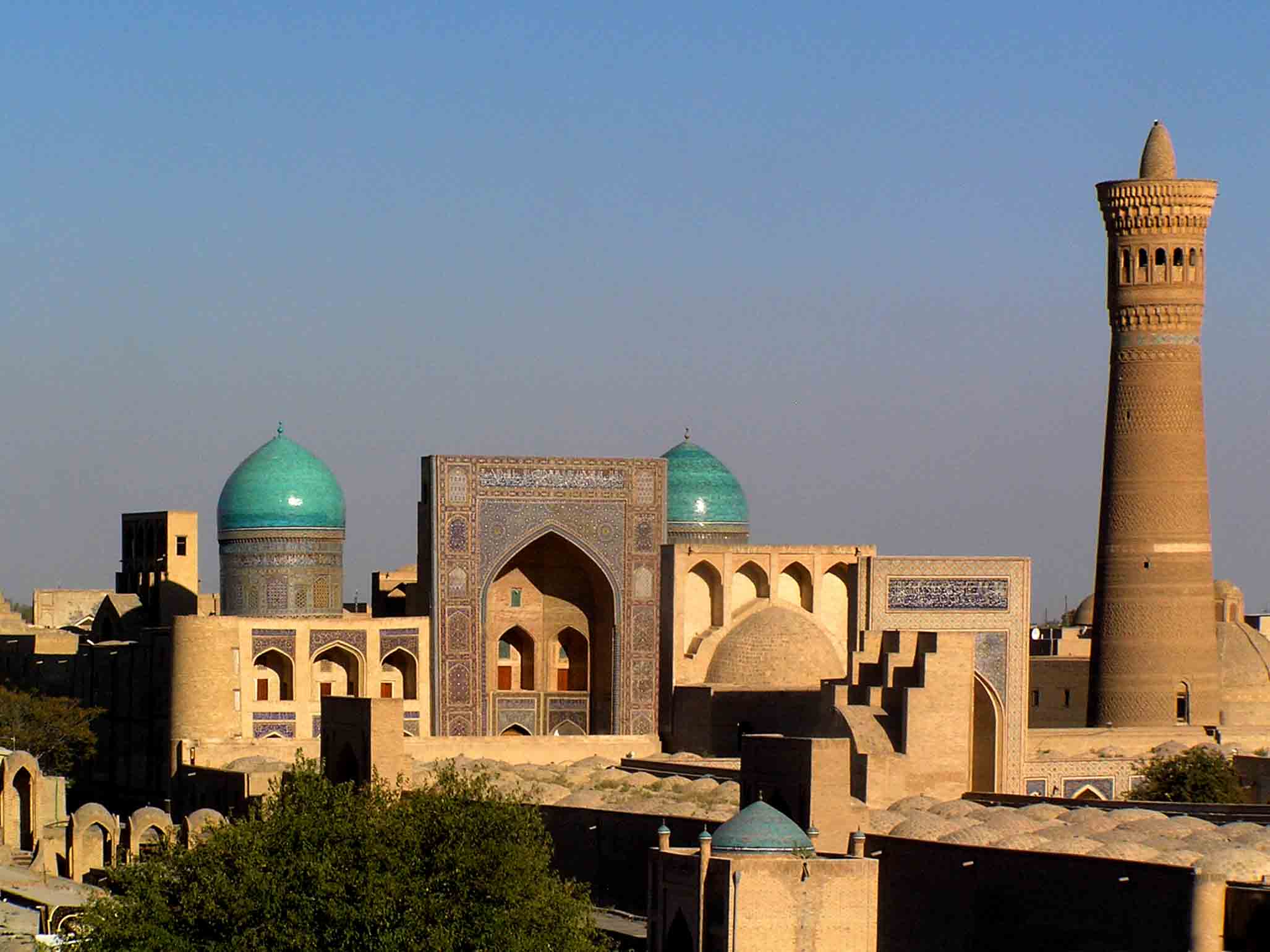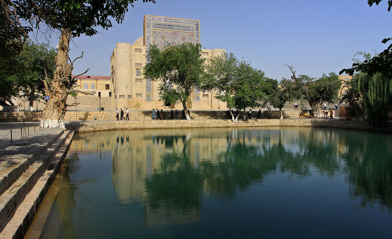 On the 16th day of our trip, we traveled by bus west to Bukhara, an ancient Silk Road oasis for camel caravans. Uzbekistan differs from the other countries of Central Asia in that it contains numerous very old cities. Bukhara itself was built up by Tajiks/Persians, not Uzbeks, and today is still predominately populated by ethnic Tajiks with Uzbek passports. The ancient architecture and design in Bukhara has been preserved better than in other places, despite being heavily bombed by the Bolsheviks, resulting in a charmingly lovely and exotic city. We visited the Zindan Prison with its infamous “bug pit” where two British spies were brutally imprisoned in the 19th century during the struggle between Britain and Russia for influence over this strategic oasis. We saw the Kalon Mosque and Minaret, the second largest mosque in Central Asia. Its minaret is ringed by 14 unique bands of brickwork and was the only structure to survive when Genghis Khan raised the city. We stayed in a delightful B&B, Sasha & Son, a “boutique hotel” in the old Jewish Quarter. It had been fashioned from several old Jewish merchant houses and decorated in the national style. It was easy to walk from the hotel to Lyabi-Hauz Plaza, the central pond and meeting place of the old city, where we found an amazing array of unique handicrafts and unusual ethnic items to satisfy even the most avid shopper. Paul told us that this is the one place where tourists often realize that they did not bring enough cash.