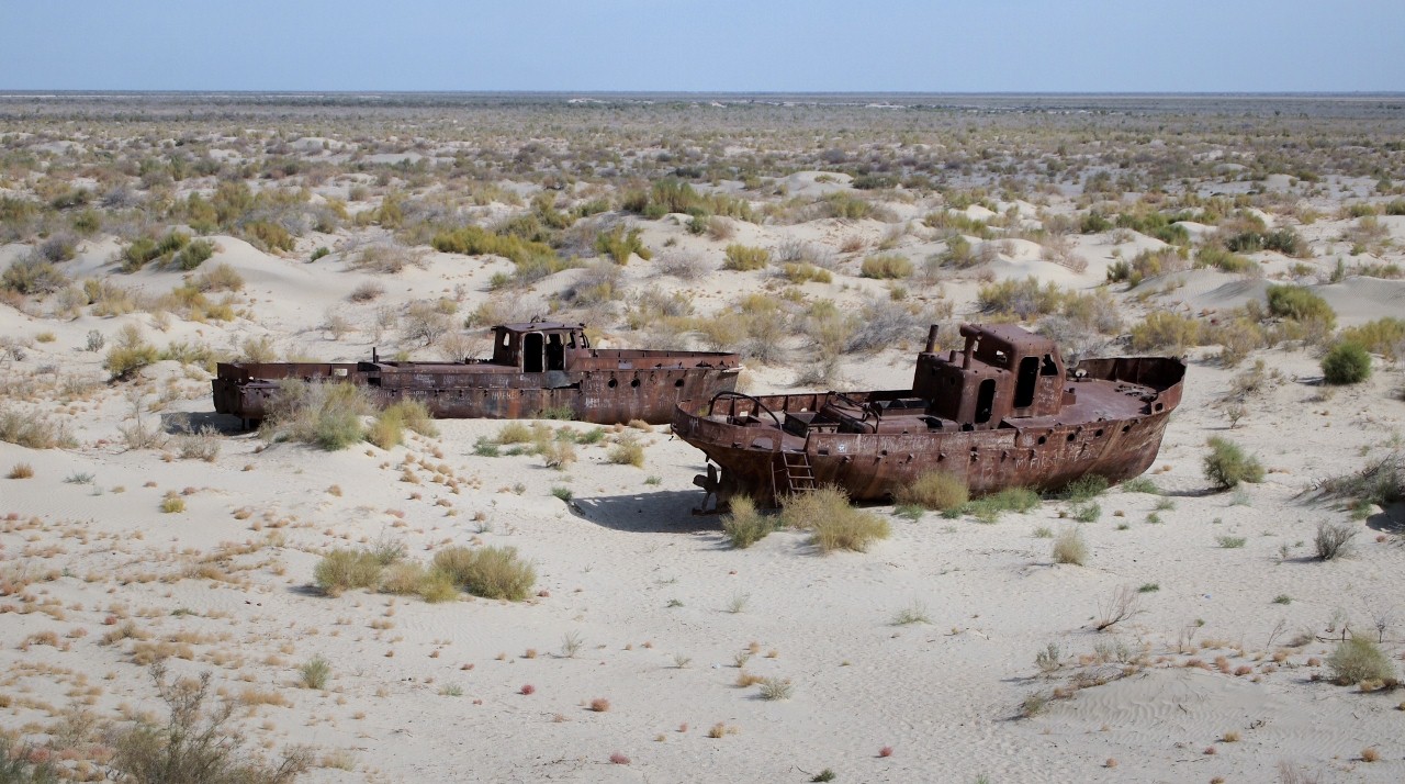 Our main objective in coming to Nukus was to take an all-day bouncy trip to Muynak, once a thriving fishing port on the Aral Sea and now not much more than a ghost town. We wanted to see the remains of the Aral Sea, formerly the fourth largest inland sea in the world. It barely exists today after the Soviet diversion of its two feeder rivers, the Amu Darya and the Syr Darya, for agricultural irrigation. Muynak is now hundreds of miles from any remaining water, which is too salty to support life. The magnitude of this ecological disaster is impossible to comprehend. We spent time walking on the sands that used to sit under some 40 or 50 feet of water, among the rusting hulks of old fishing boats and freighters. It was an eerie experience that I won’t soon forget.