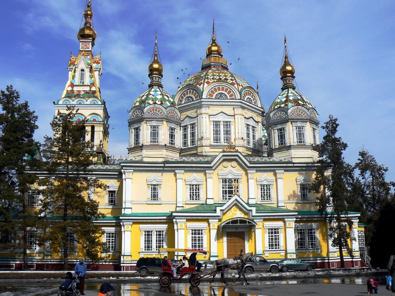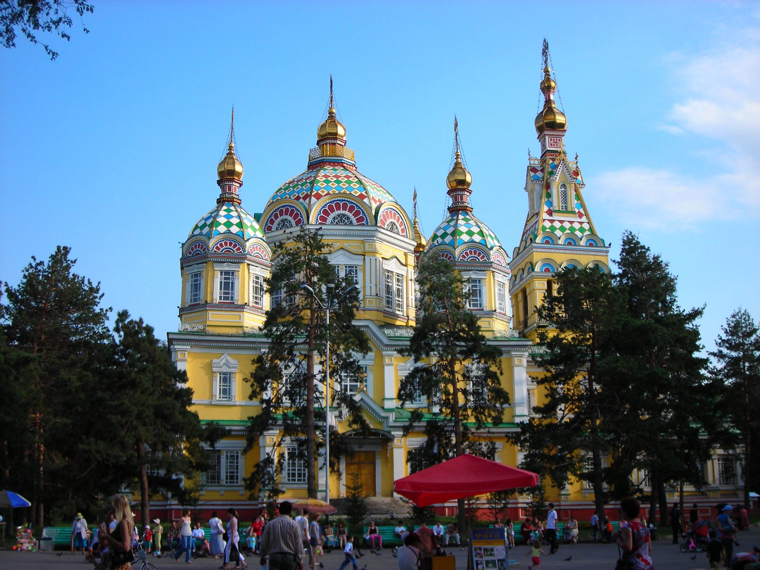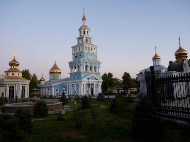 Today Almaty is a modern city made prosperous by oil and gas. Numerous very expensive sports cars line its streets. As part of a former Soviet republic, Almaty reflects Russian influences in language, architecture and demographics. What a clean city! I was amazed that streets were washed down nightly and, as we noticed throughout our entire trip of Central Asia, trash and litter were non-existent. With a population of over a million, the city proper is spread out against the foothills. Our sightseeing there included visits to a surprisingly interesting museum of ethnic musical instruments, the beautiful Zenkov cathedral, an impressive, massive World War II monument in the shape of the former Soviet Union with the obligatory eternal flame, a walk through Panfilov Park, and a cable car ride to the top of Kok-Tobe, a 3,800 foot hill featuring a recreation area and with a fabulous view overlooking the city.