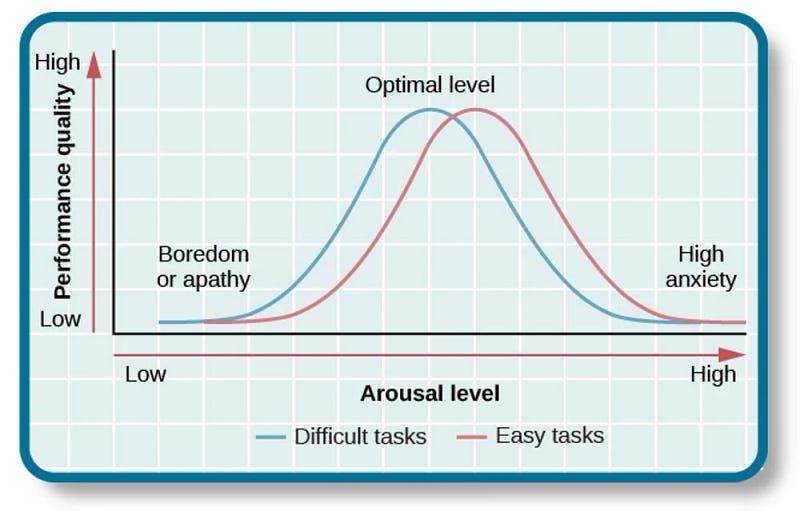 This is based on the Yerkes Dodsen principle, which observes that performance increases with appropriate levels stress/stimulation but only up to a point, after which performance decreases (and we may even shut down completely).